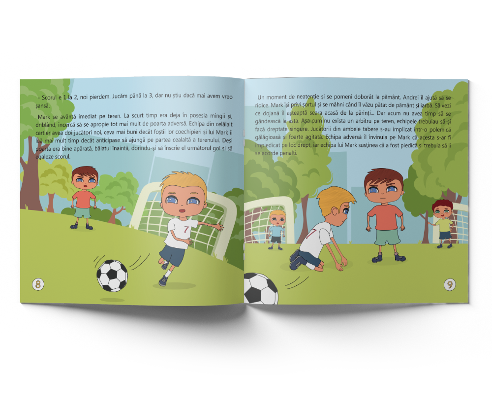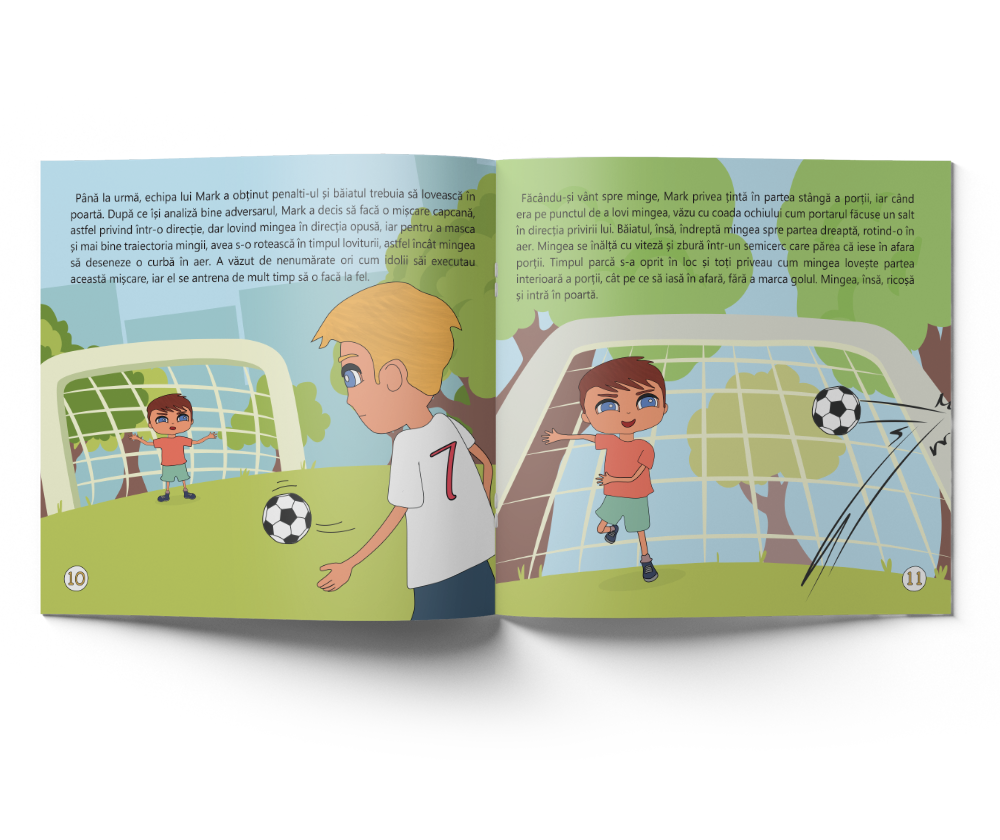 • Setul cuprinde cartea personalizată "Echipa de Fotbal" care are 24 pagini și jucăria moale Elefantul Ricco. • În cartea personalizată personajul principal din poveste are numele, culoarea ochilor și cea a părului, exact ca al băiețelului dumneavoastră. Istorioara, una plină de acțiune, îl are pe eroul nostru, cu abilități de campion, în centrul unui meci de fotbal captivant, în care urmează să ia o decizie importantă. Este o poveste, prin care cei mici învață despre cum este atins succesul atunci cand se lucrează în echipă.