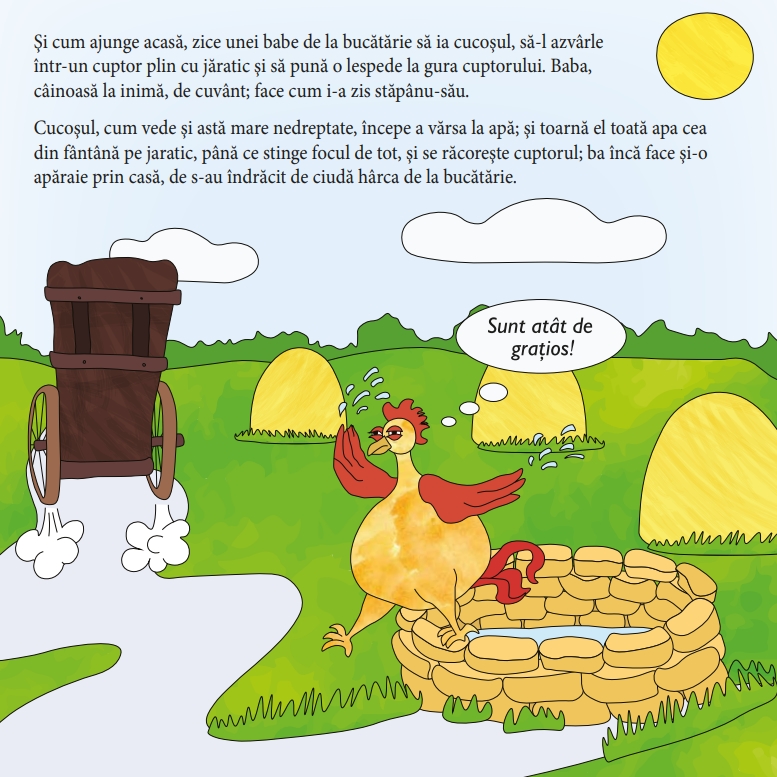 • Cartea de colorat cuprinde patru basme românești îndrăgite: Boierul și Păcală (Ioan Slavici), Cinci Pâini, Ursul păcălit de vulpe și Punguța cu doi bani (Ion Creangă). Ilustrațiile sunt realizate într-un stil modern și prietenos, cu accente umoristice care stimulează imaginația copiilor.