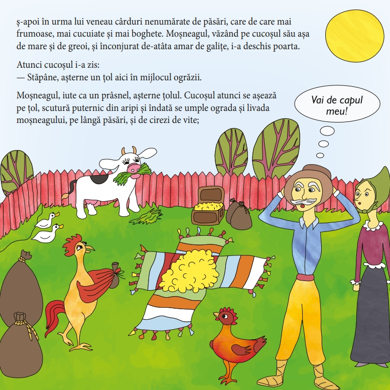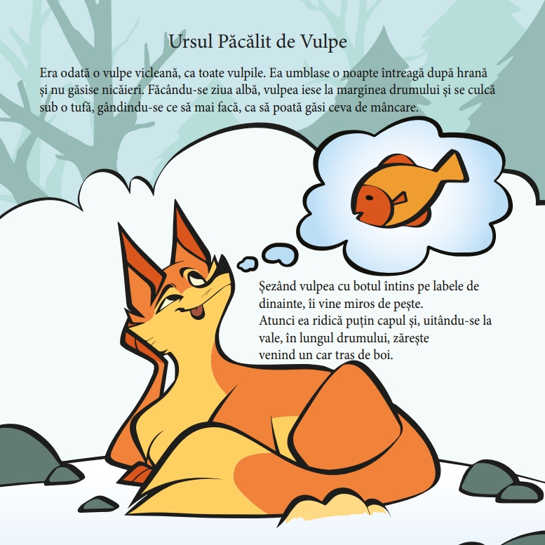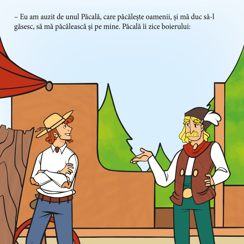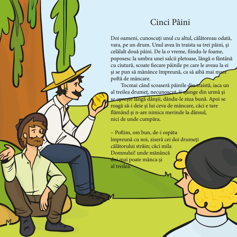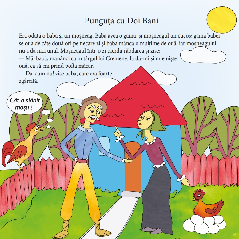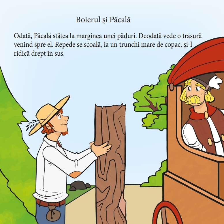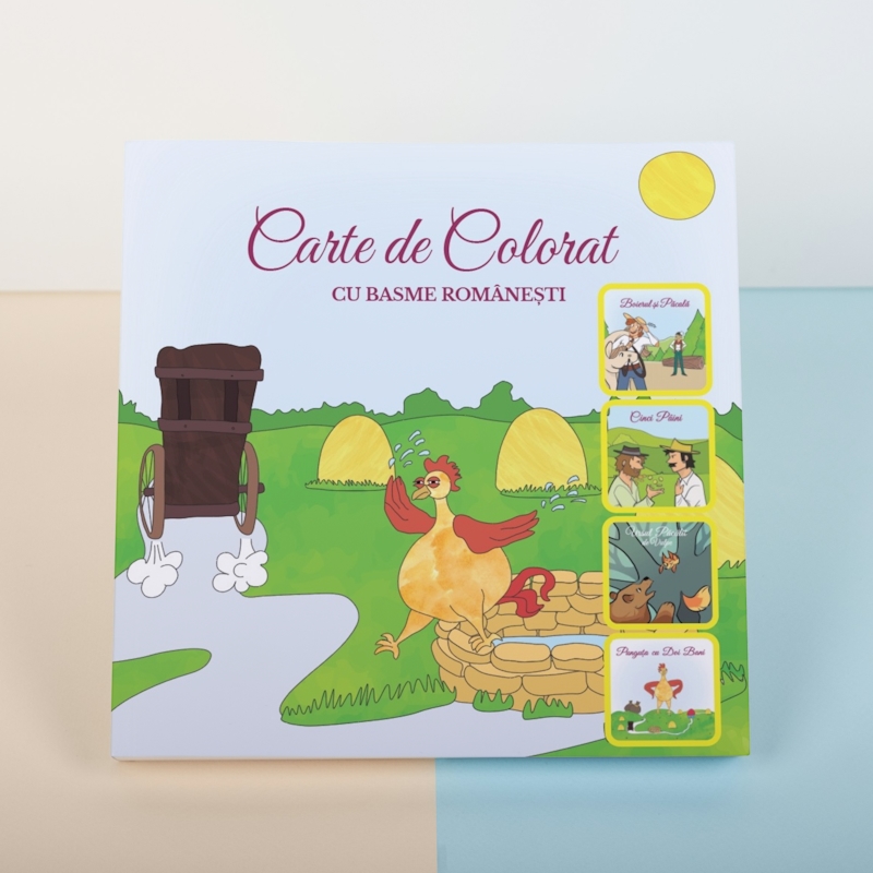 • Cartea de colorat cuprinde patru basme românești îndrăgite: Boierul și Păcală (Ioan Slavici), Cinci Pâini, Ursul păcălit de vulpe și Punguța cu doi bani (Ion Creangă). Ilustrațiile sunt realizate într-un stil modern și prietenos, cu accente umoristice care stimulează imaginația copiilor.